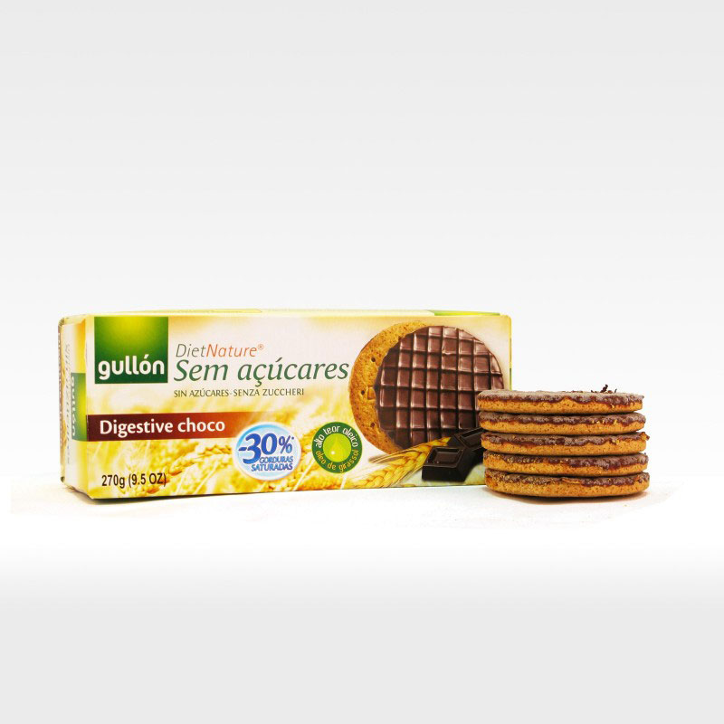 Gullon Digestiv Čoko, hrskavi biskviti sa žitaricama, bogat biljnim vlaknima za lakše varenje i sa čokoladom ali bez šećera.