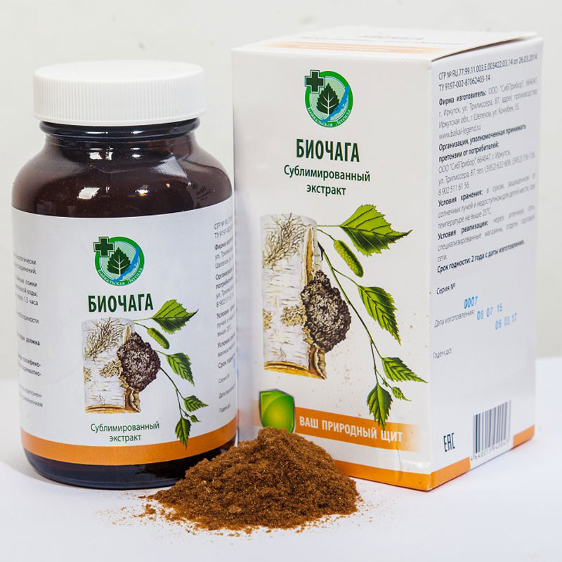 BIOCHAGA je sublimat čage. Čaga je simbiotska gljiva Inonotus Obliquus i uzima se sa sibirskih breza sa Bajkala.