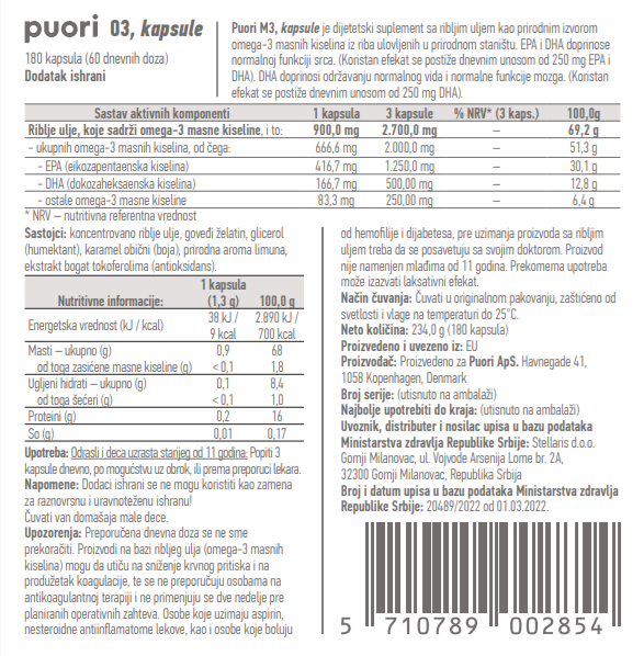 Puori O3 je jedinstvena formulacija ribljeg ulja koju je kreirao isključivo Puori. Proizvod se dobija od malih, divljih inćuna. Puori isporučuje jedno od najkoncentrovanijih prirodnih triglicerida (nTG) ribljeg ulja na svetu i isporučuje garantovano minimum od 74% prirodnih triglicerida omega-3 (2000mg) koji sadrži 1250mg EPA, 500mg DHA i 250g drugih omega-3 masnih kiselina u samo kapsu masnih kiselina.
