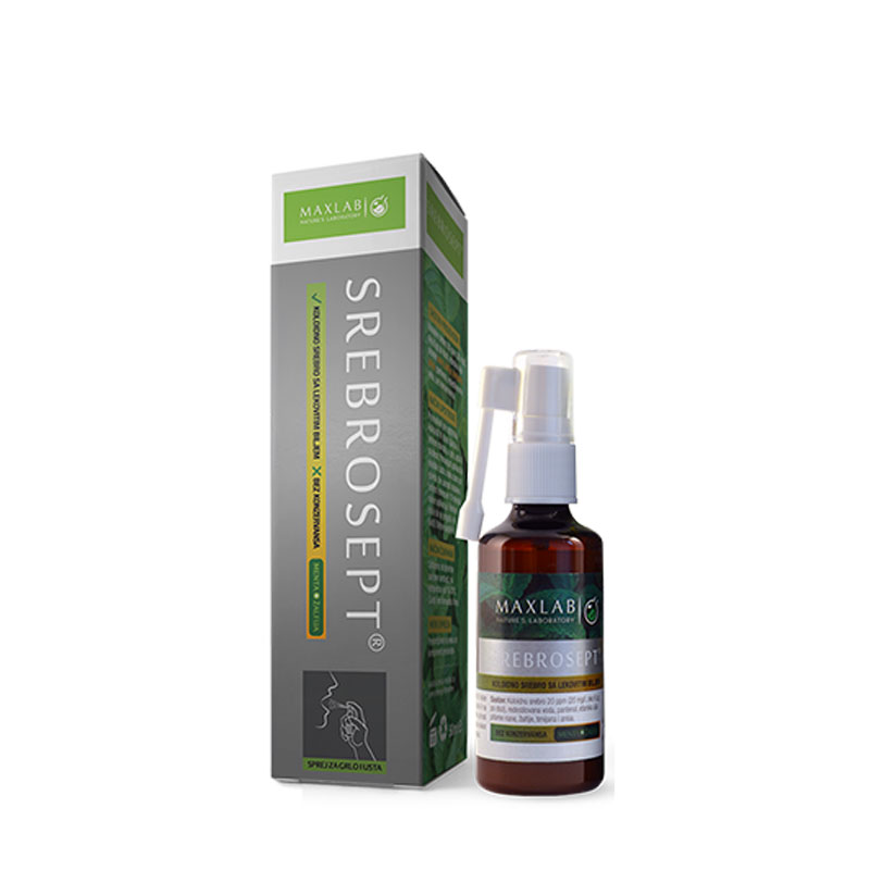 SREBROSEPT - Sprej za grlo i desni je jedinstven preparat na bazi aktivnog koloidnog srebra i etarskih ulja odabranog lekovitog bilja. Odlikuje se produženim antiseptičkim i protivupalnim delovanjem. Preparat sme da se guta, za razliku od drugih tečnosti za ispiranje usta, pošto je potpuno prirodnog sastava, bez konzervansa i štetnih veštačkih antiseptika. Upotrebom preparata se uklanja neugodan zadah iz usta, koji potiče od razvoja bakterija. Preparat može da se svakodnevno koristi za održavanje higijene usne šupljine, smanjujući rizik od nastanka karijesa i infekcija. Blagotvorno deluje kod infekcija gornjih disajnih puteva, otežanog disanja, zapaljenja desni, afti i infekcija sluzokože usta (kandida).