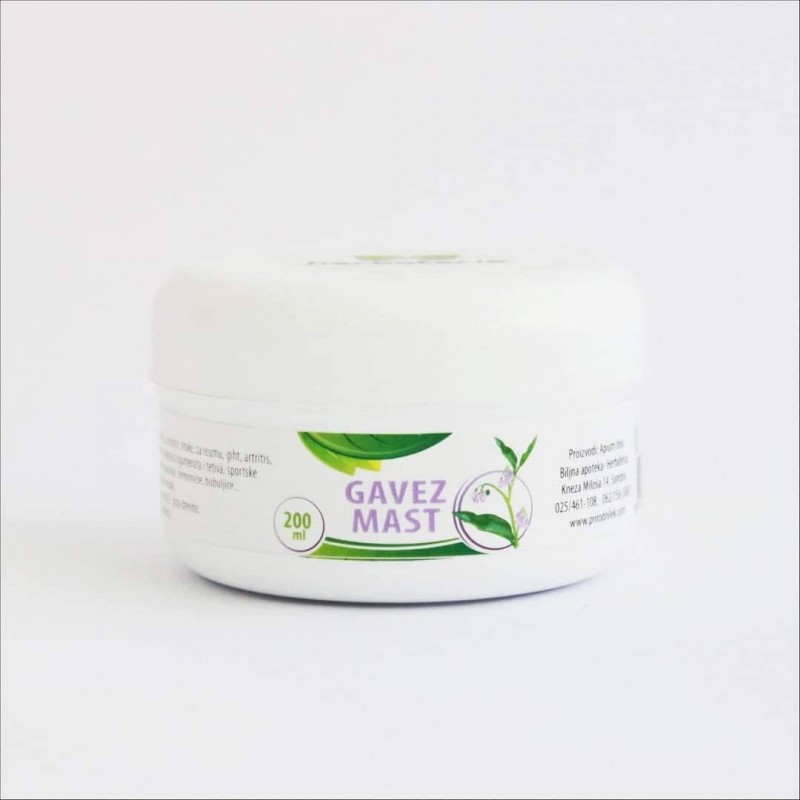 Herbateria gavez mast se koristi za zarastanje kostiju, modrice, otoke, za reumu, giht, artritis, bol u leđima, povrede, iščašenja, istegnuća ligamenata i tetiva, sportske povrede, uganuća, rane koje teško zarastaju i čireve, hemoroide, bubuljice...