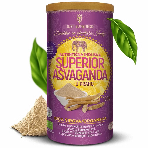 Ašvaganda je jedna od najvažnijih ajurvedskih biljaka sa adaptogenim svojstvima. Vrlo efikasno deluje na umirivanje nervne napetosti, uz podizanje energije, raspoloženja i libida - kombinacija koja je učinila izuzetno popularnom. Superior ašvaganda dobijena je prirodnoim sušenjem i mlevenjem isključivo celog korena A klaseašvagande, iz koga ništa prethodno nije ekstrahovano. Dolazi direktno iz dela Indije koji je pod Unesco zaštitom, sveže mlevena po porudžbini. Zato ima upečatljivo intenzivan ukus, koji joj daju u potpunosti očuvana bioaktivna jedinjenja, odgovorna za njena korisna svojstva.