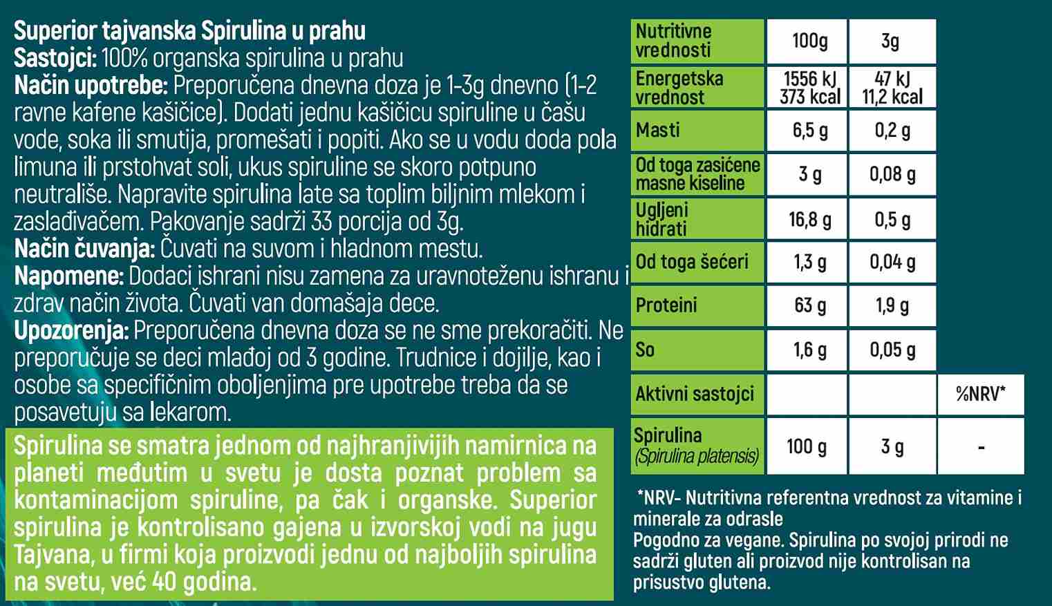 Spirulina sastav, nutritivne vrednosti na 100g/3g(po porciji):