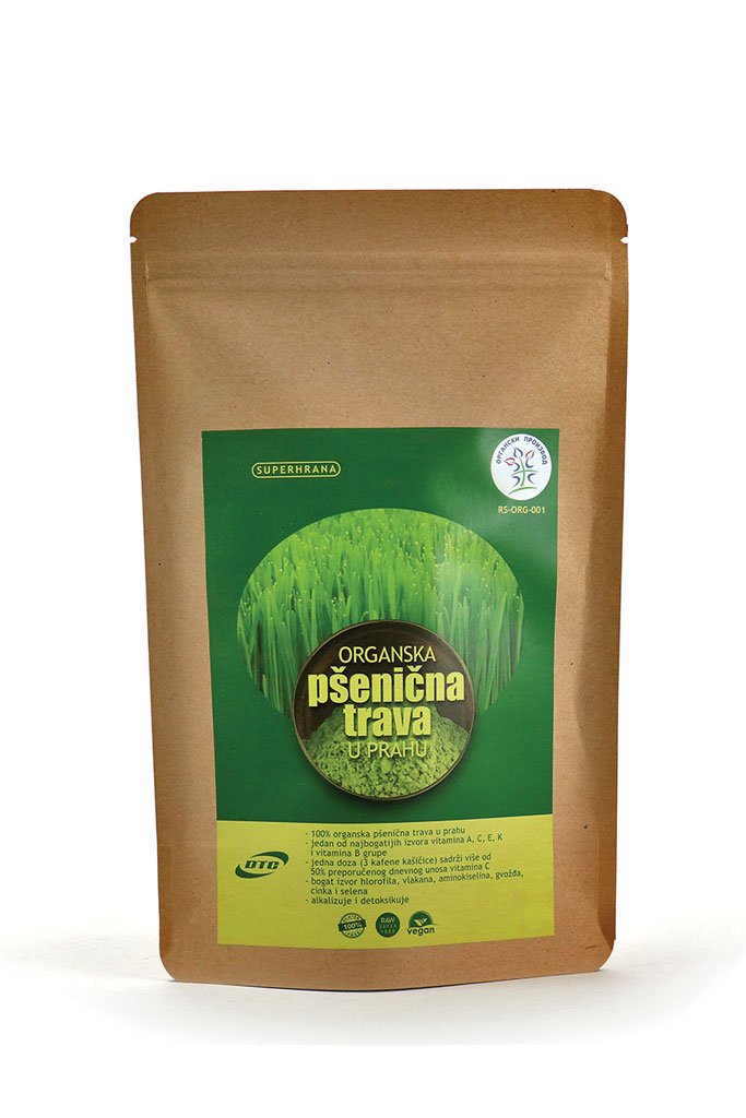 Organska pšenična trava u prahu (lat. Triticum aestivum) je bogat izvor vlakana i proteina koji doprinose rastu i održavanju mišićne mase i zdravlja kostiju. Jedan je od najbogatijih izvora vitamina A, C, E, K, i širokog spektra vitamina B. Svetlo zelena boja organske pšenične trave u prahu potiče od prisustva hlorofila, a sadrži i karotenoide, pigmente koji su odgovorni za žutu, crvenu i narandžastu boju biljaka. Zbog visokog sadržaja hlorofila vrlo je cenjena dopuna ishrani. Hlorofil, biljna krv, je po svojoj molekularnoj građi slična ljudskoj krvi. Razlika je u tome što hlorofil sadrži atomsko jezgro magnezijuma, a hemoglobin atomsko jezgro gvožđa. Hlorofil i proteini daju hemoglobin od koga se sastoji 75% naših ćelija.