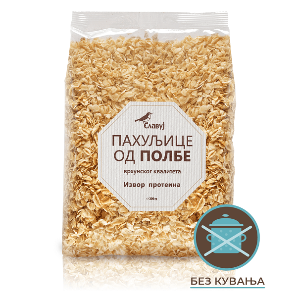 ŠTA SU TO SLAVUJEVE PAHULjICE OD POLBE? Tajna kvaliteta pahuljica od polbe je jednostavna. Uzima se celo zrno polbe, očisti se od ljuske, pri tome se ne oštećuje unutrašnja opna zrna. Propari se i spljošti se pod pritiskom. Tako pahuljice ostaju nutritivno podjednako kvalitetne kao i celo zrno polbe. Na taj način omogućena je priprema idealnog obroka za celu porodicu. Belančevine koje ulaze u sastav pahuljica od polbe održavaju u vama osećaj sitosti, podižu energiju i omogućavaju bolje usvajanje korisnih supstanci iz hrane, a korisni složeni ugljeni hidrati i vlakna poboljšavaju varenje. Početkom 21. veka ljudi su ponovo počeli da obraćaju pažnju na polbu – jednu od prvih obrađivanih žitarica u istoriji čovečanstva – koja se kao poljoprivredna kultura uzgaja već preko 10 hiljada godina. Ova blagotvorna žitarica skoro je u potpunosti zamenjena drugim, produktivnijim vrstama pšenice i lakšim za obradu. Ipak, u pogledu zdravstvenih beneficija, polba daleko nadmašuje sve moderne sorte pšenice.